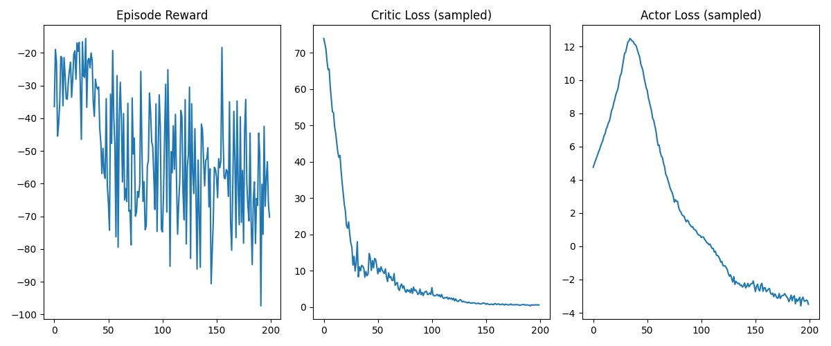 Critic loss convergence and stable actor loss trends confirm proper gradient flow and replay buffer efficiency.