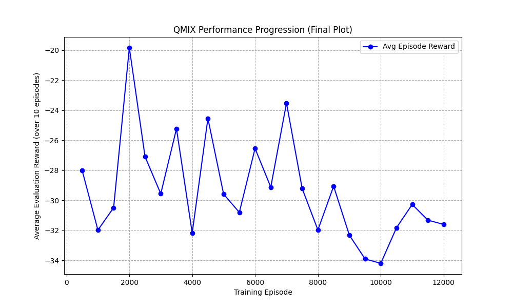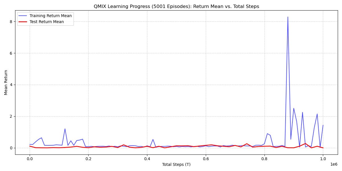 - Failure to Converge: The QMIX run did not converge to a stable, high-performing policy within the \(10^6\) steps.