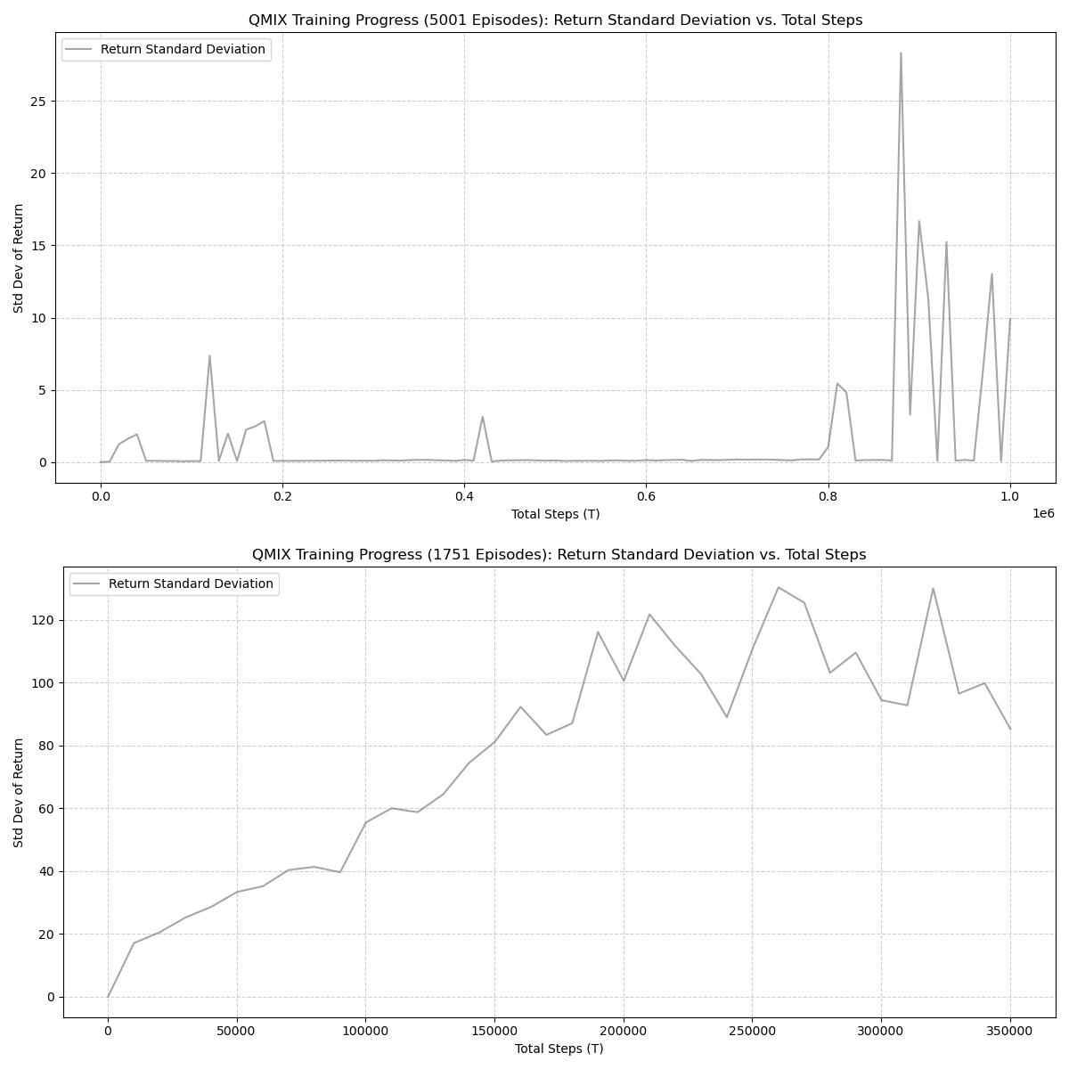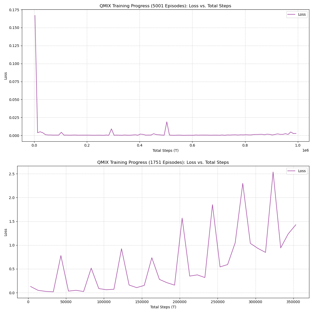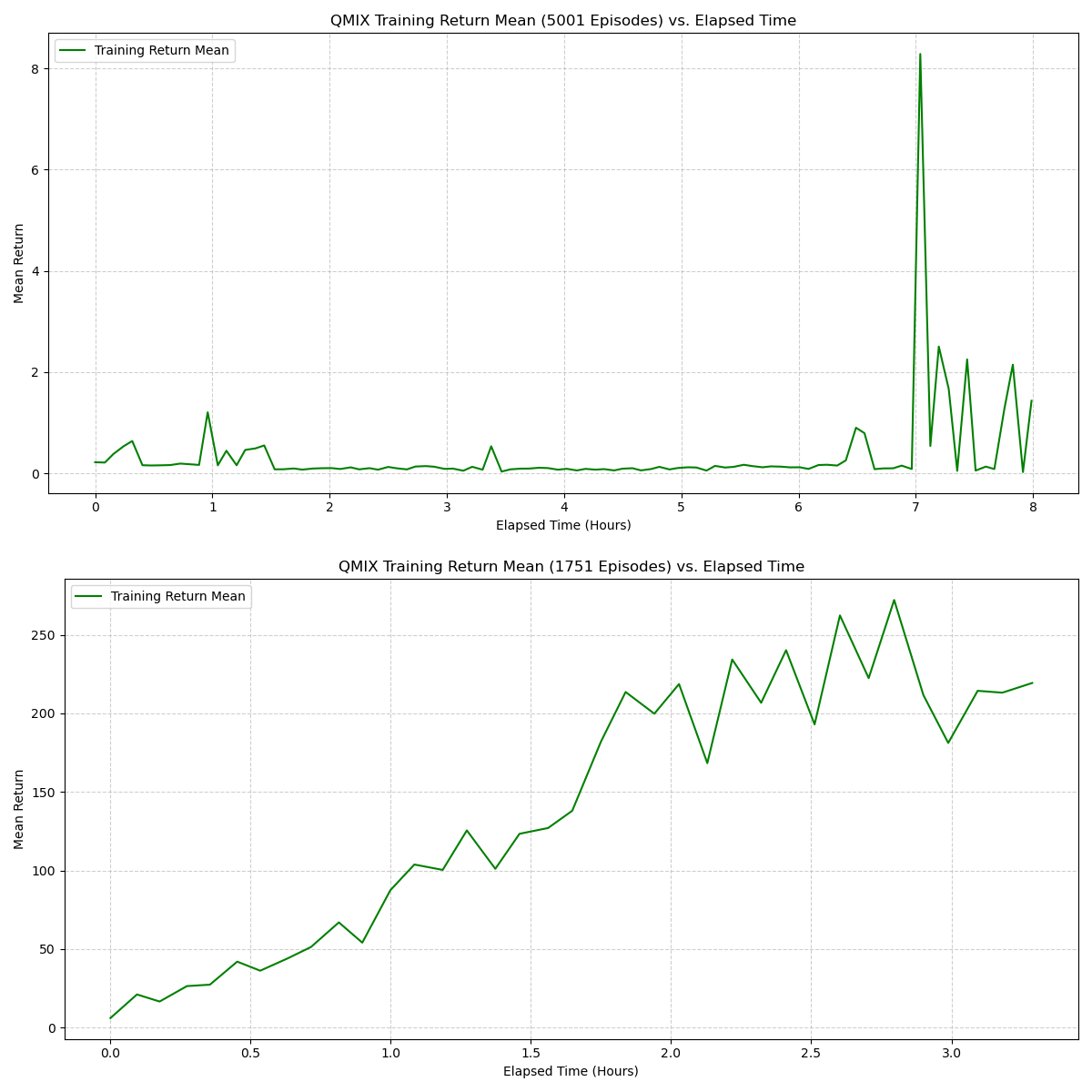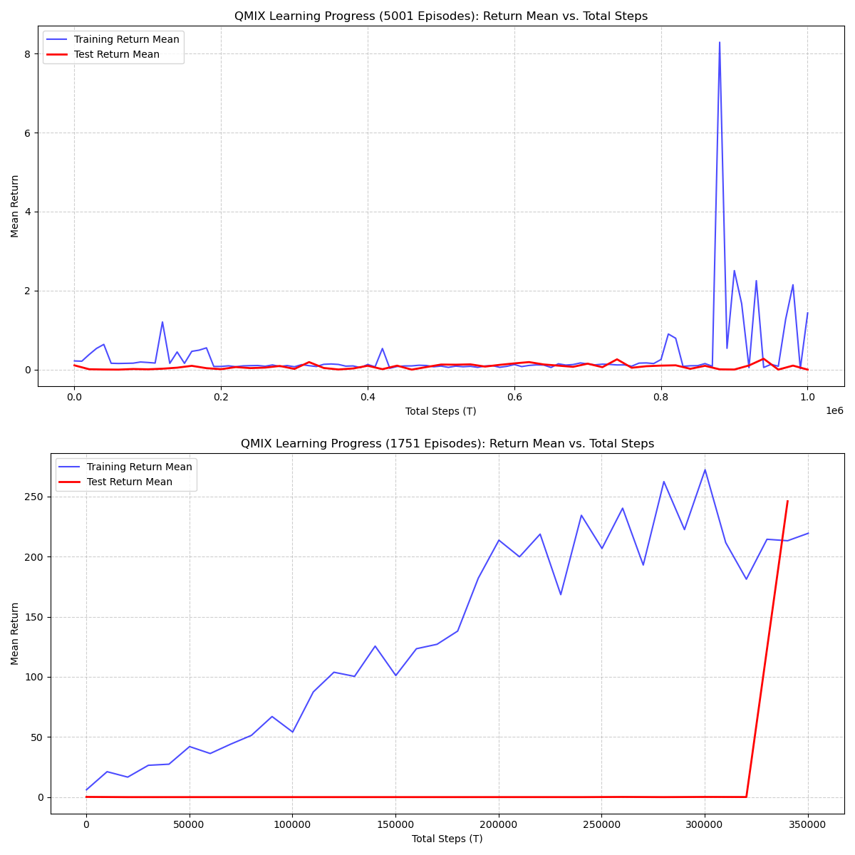 The QMIX agent demonstrates strong learning progression throughout training, with the following notable observations: