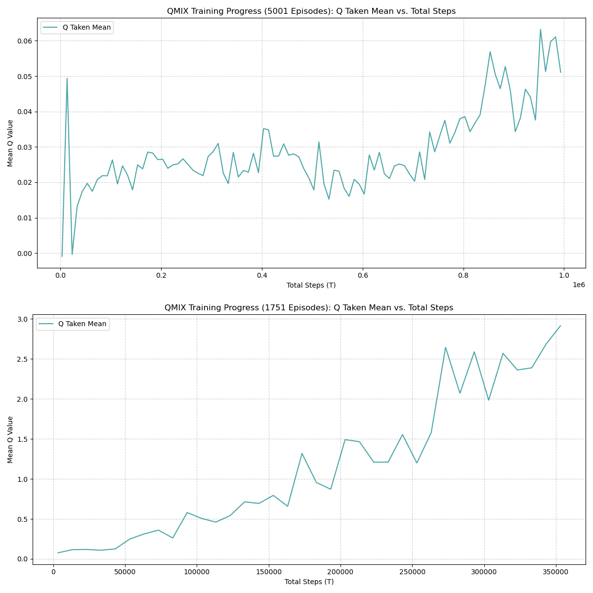 return_mean, confirming effective joint action-value decomposition under QMIX.